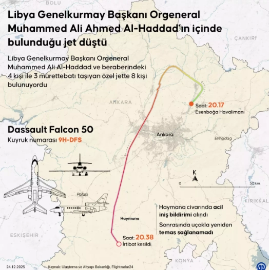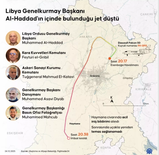Yapılan arama çalışmaları sonucunda, uçağın enkazına Ankara’nın Haymana ilçesi kırsalında ulaşılmış; uçakta bulunan Libya Genelkurmay Başkanı, Kara Kuvvetleri Komutanı, beraberindeki askerî heyet üyeleri ve uçuş ekibinin tamamının hayatını kaybettiği tespit edilmiştir.