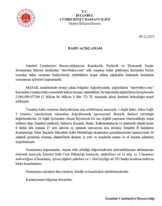 İstanbul Cumhuriyet Başsavcılığı'nın Kaçakçılık, Narkotik ve Ekonomik Suçlar Soruşturma Bürosu tarafından yürütülen soruşturma kapsamında, "showbahis.com" adlı yasadışı bahis sitesi üzerinden bahis oynatma faaliyetleri yürüttükleri tespit edilen şüphelilere yönelik geniş çaplı operasyon düzenlendi.