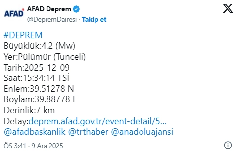 AFAD, Tunceli'nin Pülümür ilçesinde 4,2 büyüklüğünde depremin meydana geldiğini duyurdu.