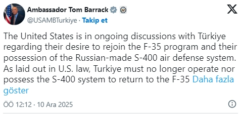 ABD yasalarının, Türkiye'nin F-35 programına dönebilmesi için S-400 sistemini kullanmaması ve bulundurmaması gerektirdiğini vurgulayan Barrack, "Başkan Trump ile Cumhurbaşkanı Erdoğan arasındaki olumlu ilişki, yeni bir işbirliği ortamı yarattı ve bu da yaklaşık 10 yıldır bu konuda yaptığımız en verimli görüşmelere yol açtı." ifadesini kullandı.