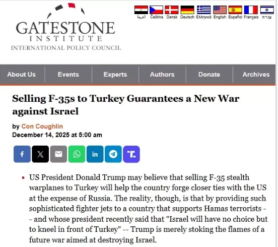 ABD merkezli ve Siyonist lobilere yakınlığıyla bilinen Gatestone Enstitüsü'nde The Daily Telegraph gazetesinin Savunma Editörü Con Coughlin'in imzasıyla yayınlanan bir analizde, Türkiye'ye F-35 savaş uçaklarının satılmasının, İsrail'i hedef alacak yeni bir savaşı garantileyeceği iddia edildi. Analizde, Trump'ın bu satışla Türkiye'yi Rusya'dan uzaklaştırıp ABD'ye yaklaştıracağına inandığı, ancak bu hamlenin Hamas'ı destekleyen bir ülkeye son teknoloji silah vermek anlamına geleceği ve barut fıçısı bölgeyi ateşleyeceği vurgulandı.