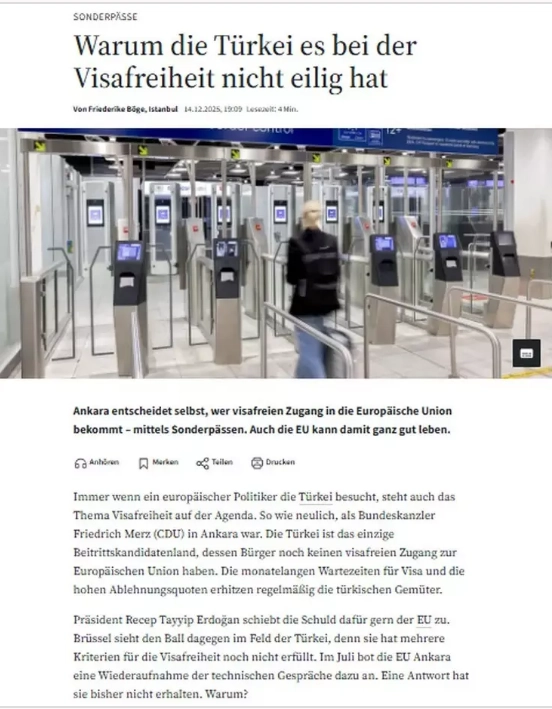 Gazeteye göre Ankara, özel pasaportlar üzerinden Avrupa’ya vizesiz giriş hakkını kendi belirliyor ve bu durum Brüksel’in de işine geliyor.