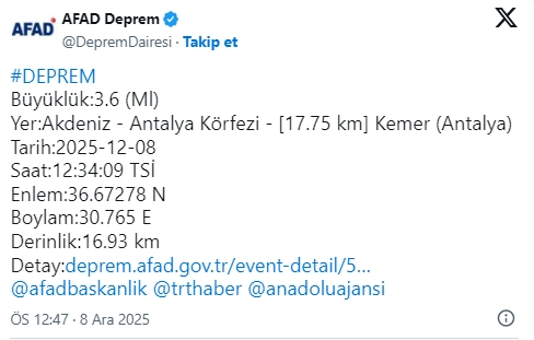 İçişleri Bakanlığı Afet ve Acil Durum Yönetimi Başkanlığı (AFAD) Antalya Körfezi'nde 3,5 büyüklüğünde bir depremin meydana geldiğini açıkladı.AFAD verilerine göre 12.24'deki deprem 16.93 km derinlikte gerçekleşti..