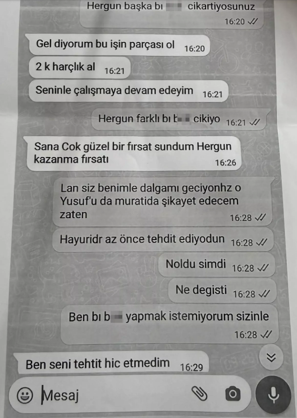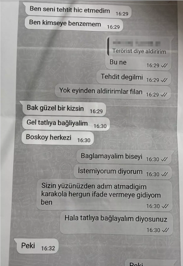 Hakkında açılan 20 davadan 11'inin ülke genelindeki çeşitli mahkemelerde sürdüğünü söyleyen Özlem Develi, M.D. hakkında şikayetçi olduğu için M.D. ve çevresindekilerin tehditlerine maruz kaldığını, M.D.'nin "Seni sabah evinden terörist diye aldırırım. Gel bu işin parçası ol, 2 bin lira harçlık al, seninle çalışmaya devam edeyim. Güzel bir kızsın, gel tatlıya bağlayalım" şeklinde kendisine mesaj attığını söyledi.