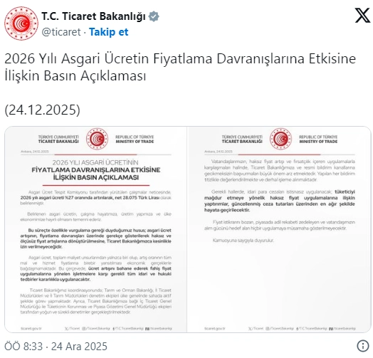 Bu tablo üzerine Ticaret Bakanlığı denetimleri artırdı. Zincir marketler ve büyük perakendecilerle yapılan toplantılarda, işçilik maliyetinin toplam fiyat içindeki payının sınırlı olduğu hatırlatıldı. Bakanlık, “asgari ücret arttı” bahanesiyle yapılan zamların kabul edilemeyeceğini açıkça ifade etti.