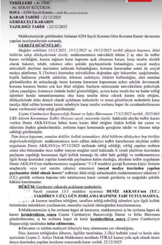 Söz konusu karara rağmen Deniz Akkaya'nın Seda Akgül’e yönelik hakaret ve tehdit içerikli paylaşımlarına devam ettiği tespit edildi. Mahkeme, 6284 sayılı Kanun kapsamında verilen tedbirlerin delinmesi nedeniyle Akkaya’nın 3 gün süreyle zorlama hapsine çarptırılmasına hükmetti. Deniz Akkaya’nın bu karara karşı yasal süre içerisinde itiraz etme hakkı bulunuyor. İtirazın reddedilmesi durumunda cezanın infazı gerçekleştirilecek.