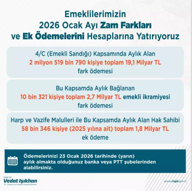 Çalışma ve Sosyal Güvenlik Bakanı Vedat Işıkhan, "Emekli Sandığı kapsamında 2026 yılı zam farkları ile harp ve vazife malullüğü aylığı alan vatandaşlarımızın 2025 yılı ek ödemelerini yarın hesaplarına yatırıyoruz" dedi.