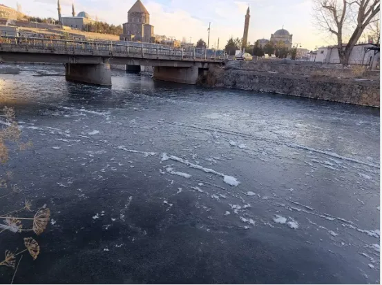 Kars Çayı’nın yüzeyi, dondurucu soğuklar nedeniyle sadece bir gün içerisinde tamamen buzla kaplandı. Çayın donmuş görüntüsü, bölgenin ne denli çetin bir kış yaşadığını gözler önüne seriyor.