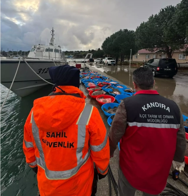 Kocaeli'nin Kandıra ilçesinde gerçekleştirilen denetimlerde, yasa dışı yollarla avlandığı belirlenen yaklaşık 500 kalkan balığına el konuldu.
