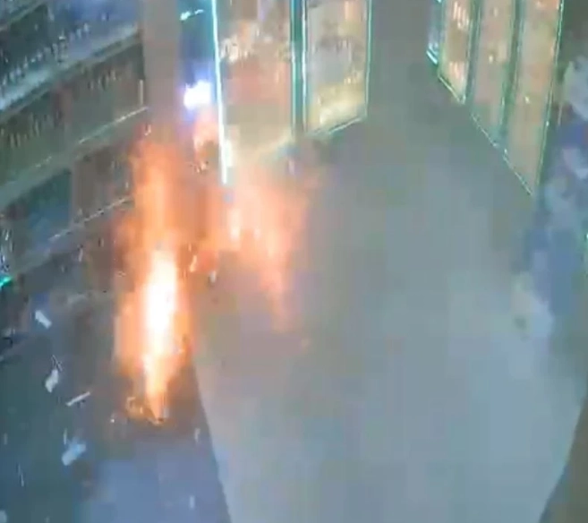 Öte yandan olay, güvenlik kamerasına yansıdı. Görüntülerde, yüzü kapalı şüphelinin kapısını açtığı marketten içeri patlayıcı madde atıp kaçtığı, bir süre sonra patlamanın meydana geldiği ve yangın çıktığı, iş yerinin yanından geçen bir kadının da patlama sırasında kırılan camlardan etkilenip, hızla bölgeden uzaklaştığı görüldü.