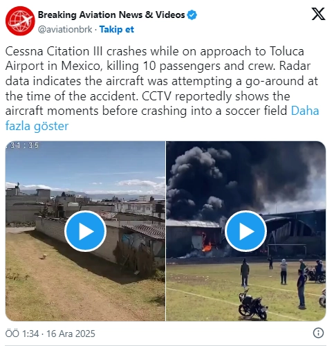 Meksiko Sivil Koruma Koordinatörü Adrian Hernandez, Meksiko'nun yaklaşık 50 kilometre batısında, Toluca Havalimanı'na 5 kilometre uzaklıkta acil iniş yapmaya çalışan küçük bir uçağın düştüğünü belirtti. Hernandez, 8 yolcu ve 2 mürettebatın bulunduğu uçakta kurtulan olmadığını kaydetti. Kazanın nedenine ilişkin soruşturma başlatıldı.
