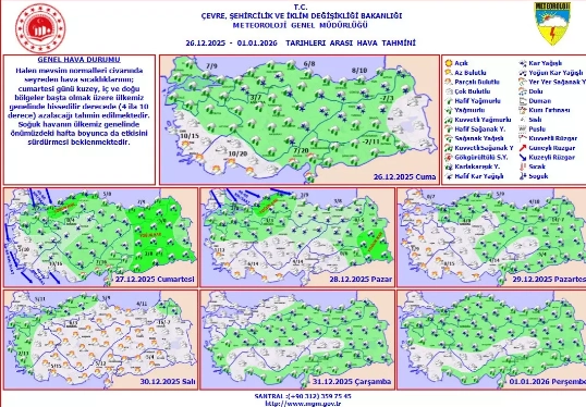 "Yapılan son meteorolojik değerlendirmelere göre; 26 Aralık 2025 cuma gününden itibaren ülkemizin batı kesimlerinden başlayarak soğuk ve yağışlı havanın etkisi altına girmesi beklenmektedir. Yağışların; Ülkemizin kuzey, iç ve doğusunda karla karışık yağmur ve kar şeklinde olacağı tahmin edilmektedir.