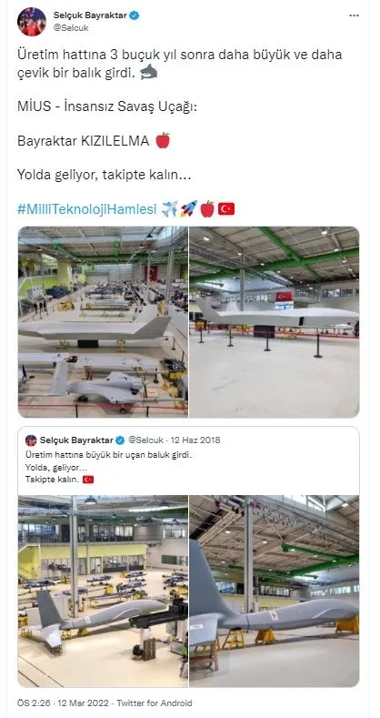 Bugün Twitter hesabından MİUS ile ilgili 2018'de attığı tweeti alıntılayarak paylaşımda bulunan Selçuk Bayraktar, "Üretim hattına 3 buçuk yıl sonra daha büyük ve daha çevik bir balık girdi. MİUS - İnsansız Savaş Uçağı: Bayraktar KIZILELMA. Yolda geliyor, takipte kalın..." ifadelerini kullandı.