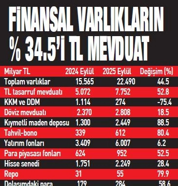 Rapora göre hanehalkının finansal varlıkları Eylül 2025 itibarıyla son 1 yılda yüzde 44.5 artarak 22 trilyon 490 milyar liraya ulaştı. Hanehalkının finansal varlıkları içinde TL mevduat ve yatırım fonları çoğunluğu oluşturmaya devam ediyor. Ağustos ayı sonunda hesap açma ve yenileme işlemlerinin sonlandırıldığı kur korumalı mevduat ürünlerinin hanehalkı varlıkları içindeki payı giderek azalarak yüzde 1'e düştü. Bu oran kasım sonu itibarıyla neredeyse sıfırlandı.
