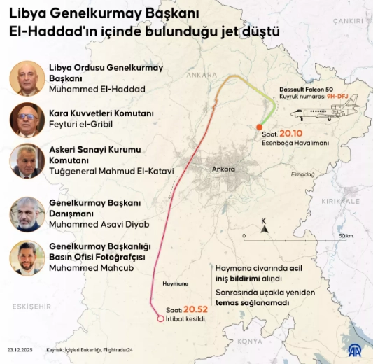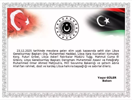 "23.12.2025 tarihinde meydana gelen elim uçak kazasında şehit olan Libya Genelkurmay Başkanı Org. Muhammed Haddad, Libya Kara Kuvvetleri Komutanı Korg. Futuri Gribel, Libya Askeri Fabrikalar Müdürü Tuğg. Mahmut Cuma El Giteyvi, Libya Genelkurmay Başkanı Danışmanı Muhammed Assavi ve fotoğrafçı Muhammed Omar Ahmed Mahjoub'a, Milli Savunma Bakanlığı ve şahsım adına Allah'tan rahmet, dost ve kardeş Libya halkına başsağlığı ve sabırlar dileriz."