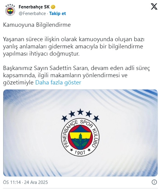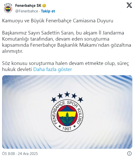 Sarı-lacivertli kulüpten yapılan açıklamada, “Yaşanan sürece ilişkin olarak kamuoyunda oluşan bazı yanlış anlamaları gidermek amacıyla bir bilgilendirme yapılması ihtiyacı doğmuştur. Başkanımız Sayın Sadettin Saran, devam eden adli süreç kapsamında, ilgili makamların yönlendirmesi ve gözetimiyle birlikte kulübümüzden kendi aracıyla Maslak İl Jandarma Komutanlığı’na gitmiştir. Süreç, başından itibaren son derece sakin ve medeni bir şekilde yürütülmüştür. Başkanımıza, ilgili birimler tarafından gerekli tüm kolaylıklar sağlanmış olup; Sayın Başkanımız da sürecin her aşamasında yapıcı ve sorumlu bir tutumla eşlik etmiştir. Sürecin bu aşamasında, yüce Türk yargısına güvenmek ve itidalli bir duruş sergilemek, her Fenerbahçeliden en önemli ricamızdır. Kamuoyunun bilgisine saygıyla sunarız” ifadeleri kullanıldı.