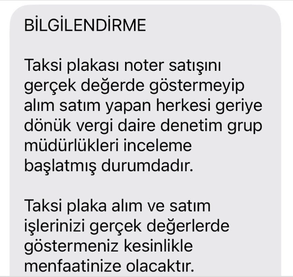 Dün taksi esnafına yönelik olarak SMS gönderen galerici, taksi plakası noter satışını gerçek değerde göstermeyip alım-satım yapan herkesi geriye dönük vergi daire denetim grup müdürlüklerinin incelemeye aldığını iddia etti.