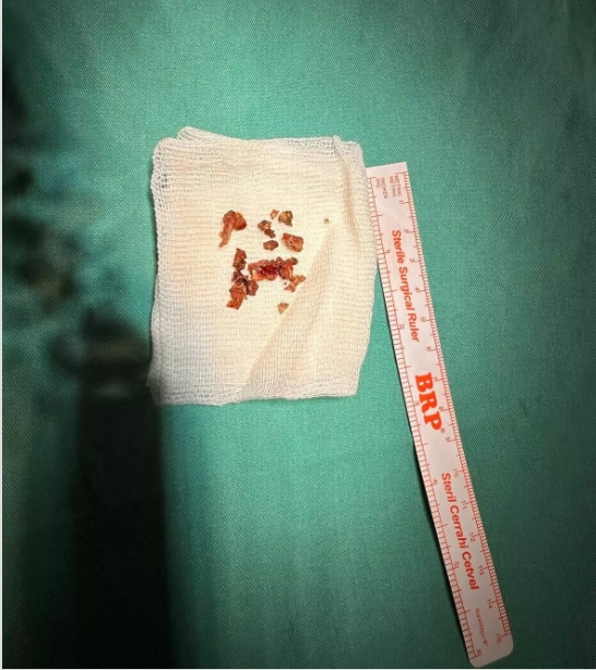 Kulak Burun Boğaz (KBB) Doktoru Op. Dr. Erhan Demirbağ tarafından gerçekleştirilen ameliyatta, burun boşluğu içinde tıpta "rinolit" olarak adlandırılan taş oluşumları tespit edildi.
