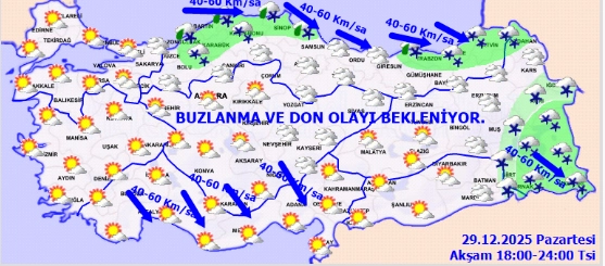 Kuzey, iç ve doğu kesimlerde buzlanma ve don ile birlikte pus, yer yer sis görüleceği tahmin ediliyor.