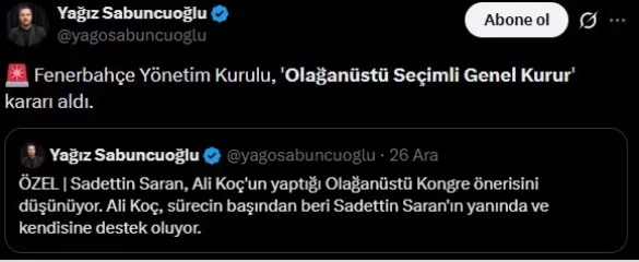 Ünlü gazeteci Yağız Sabuncuoğlu, sosyal medya hesabından yaptığı paylaşımda Sarı-lacivertli takımın “Olağanüstü Seçimli Genel Kurul” kararı aldığını duyurdu.