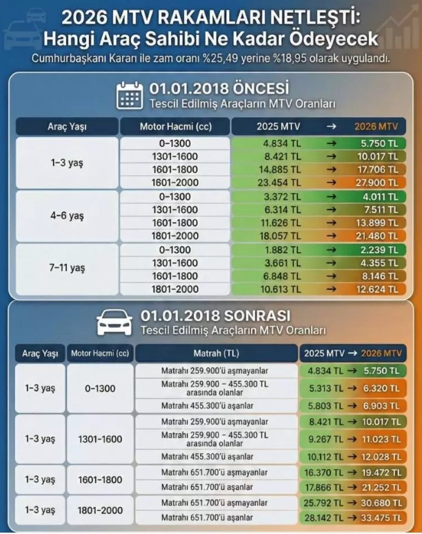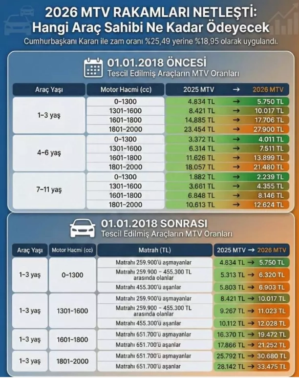 01.01.2018 sonrasında tescil edilmiş araçların MTV tutarları: