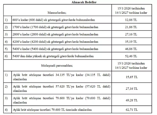 Sözleşmeli personelden aylık brüt sözleşme ücreti 34 bin 135 liraya kadar (bu tutar dahil) olanlardan günlük 15,65 lira, 57 bin 620 liraya kadar (57 bin 620 lira dahil) olanlardan günlük 27,16 lira, 79 bin 600 liraya kadar (79 bin 600 lira dahil) olanlardan günlük 49,28 lira ve 79 bin 600 liranın üzerinde olanlardan günlük 62,71 lira yemek bedeli alınacak.