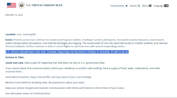 ABD'nin Tahran Sanal Büyükelçiliği, İran'da bulunan vatandaşlarına çağrıda bulunarak, "ABD vatandaşları İran'ı hemen terk etmelidir. Güvenli ise, karayoluyla Türkiye veya Ermenistan'a gitmeyi düşünün." uyarısı yapıldı.