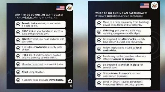 Büyükelçiliğin paylaşımında, deprem anında ve sonrasında izlenmesi gereken adımlar anlatıldı. Yaralanma riskini azaltmak için "Çök, Kapan, Tutun" kuralının hayati öneme sahip olduğu belirtildi.