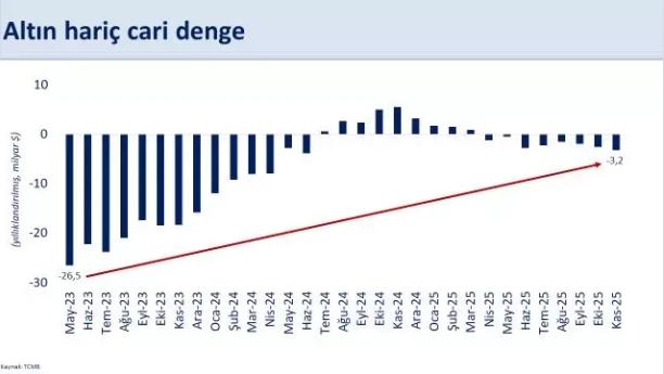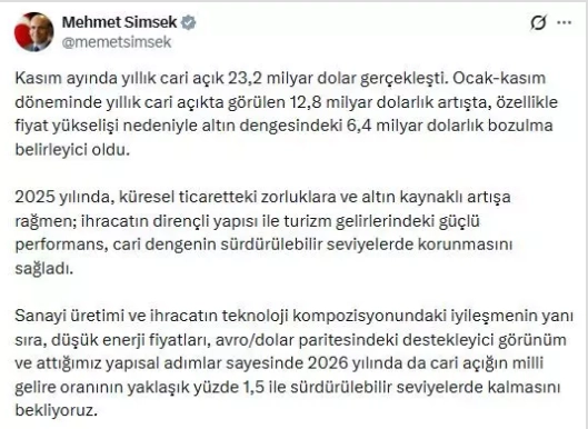 Bakan Şimşek, "Kasım ayında yıllık cari açık 23,2 milyar dolar gerçekleşti. Ocak-kasım döneminde yıllık cari açıkta görülen 12,8 milyar dolarlık artışta, özellikle fiyat yükselişi nedeniyle altın dengesindeki 6,4 milyar dolarlık bozulma belirleyici oldu. 2025 yılında, küresel ticaretteki zorluklara ve altın kaynaklı artışa rağmen; ihracatın dirençli yapısı ile turizm gelirlerindeki güçlü performans, cari dengenin sürdürülebilir seviyelerde korunmasını sağladı. Sanayi üretimi ve ihracatın teknoloji kompozisyonundaki iyileşmenin yanı sıra, düşük enerji fiyatları, avro/dolar paritesindeki destekleyici görünüm ve attığımız yapısal adımlar sayesinde 2026 yılında da cari açığın milli gelire oranının yaklaşık yüzde 1,5 ile sürdürülebilir seviyelerde kalmasını bekliyoruz" ifadelerini kullandı.