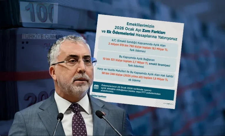 Bakan Işıkhan, Emekli Sandığı kapsamında aylık alan vatandaşların 2026 yılı Ocak ayı zam farkları ile harp ve vazife malullüğü aylığı alanların 2025 yılına ait ek ödemelerinin yarın hesaplara yatırılacağını duyurdu.
