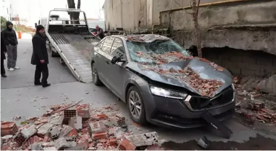 Eyüpsultan'da yıkım çalışmaları devam eden bir binanın bağlantı noktaları kesilen duvarı, şiddetli rüzgarın etkisiyle park halindeki araçların üzerine devrildi.
