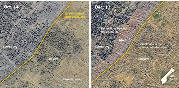 New York Times'ın yayınladığı rapora göre İsrail kuvvetleri ateşkesten bu yana sarı çizginin her iki tarafında da yıkımlara devam ediyor. Buna göre; Filistinlilerin özel mülkleri, çok sayıda tarım arazisi ve seralar yok edildi.