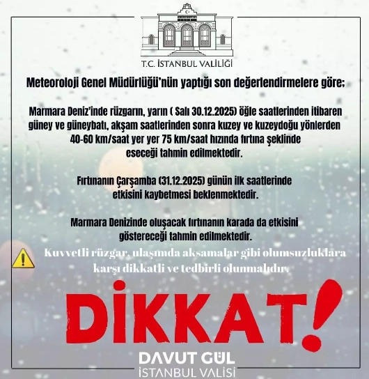 Valilikten yapılan açıklamada, "Meteoroloji Genel Müdürlüğü'nün değerlendirmelerine göre; Marmara Deniz'inde rüzgarın, yarın ( Salı 30.12.2025) öğle saatlerinden itibaren güney ve güneybatı, akşam saatlerinden sonra kuzey ve kuzeydoğu yönlerden 40-60 km/saat yer yer 75 km/saat hızında fırtına şeklinde eseceği tahmin edilmektedir. Fırtınanın Çarşamba (31.12.2025) günün ilk saatlerinde etkisini kaybetmesi beklenmektedir. Marmara Denizi'nde oluşacak fırtınanın karada da etkisini göstereceği tahmin edilmektedir. Kuvvetli rüzgar, ulaşımda aksamalar gibi olumsuzluklara karşı dikkatli ve tedbirli olunmalıdır" ifadeleri kullanıldı.
