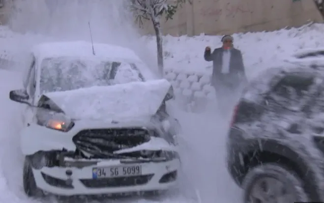 İstanbul Esenyurt'ta etkili olan karın yağışıyla birlikte yollar buz pistine döndü. Kaygan yolda direksiyon hakimiyetini kaybeden sürücüler, önündeki araca çarptı. O anlar cep telefonu kamerasına yansıdı.