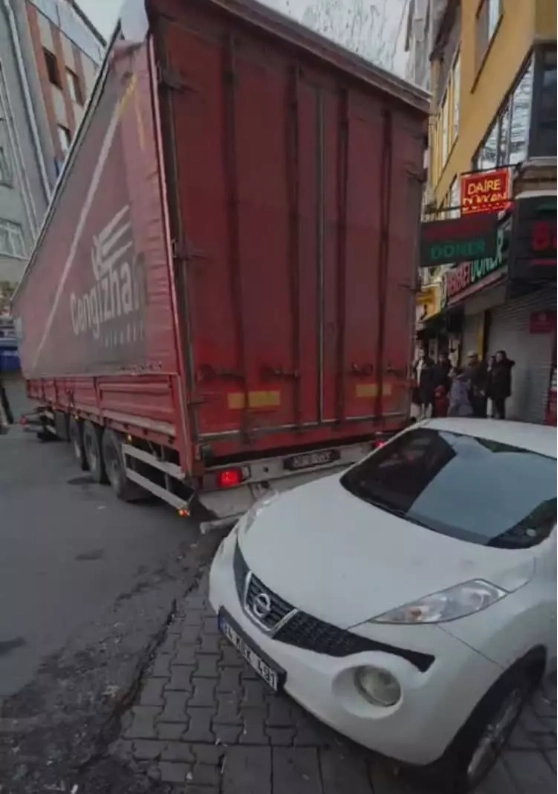 Kağıthane’de dar sokakta ilerleyen tır, dönmek için manevra yaptığı esnada park halindeki 3 araca çarparak zarar verdi.
