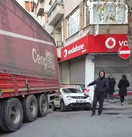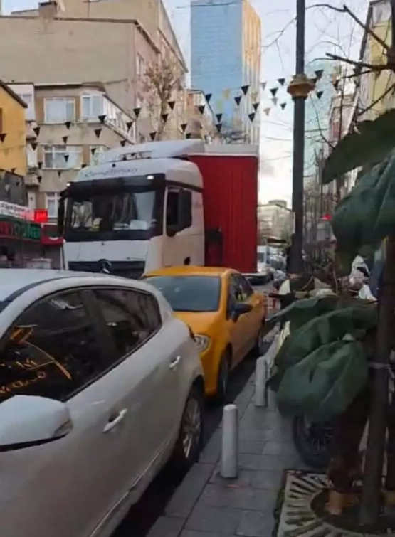 İşlek caddede uzun süre trafiğin durmasına neden olan tır şoförü, manevra yapmayı sürdürerek park halindeki başka bir otomobile daha çarptı.