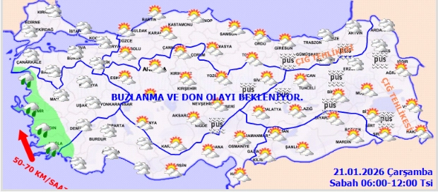 Sabah ve gece saatlerinde Marmara'nın doğusu ile iç ve doğu bölgelerde buzlanma ve don olayı ile birlikte pus ve yer yer sis bekleniyor. Doğu Karadeniz’in iç kesimlerinin yüksekleri ile Doğu Anadolu’nun doğusunda yüksek kar örtüsüne sahip eğimli kesimlerinde çığ tehlikesi bulunmaktadır.