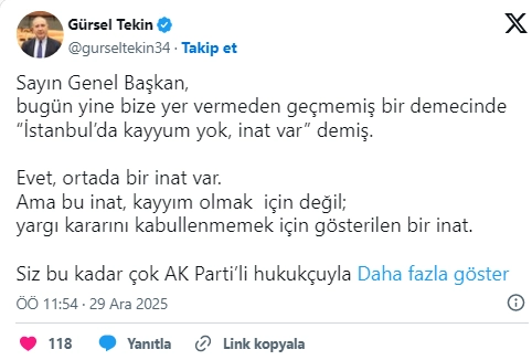 Özel’in açıklaması sonrasında ise Gürsel Tekin, sosyal medya X hesabından, mahkeme kararının yok sayılmasına, "İnat var ama, yargı kararını kabullenmemek için gösterilen bir inat" diyerek tepki gösterdi.