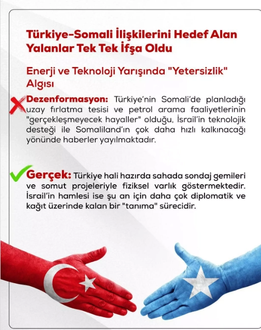 Dezenformasyon: Türkiye’nin Somali’de planladığı uzay fırlatma tesisi ve petrol arama faaliyetlerinin "gerçekleşmeyecek hayaller" olduğu, İsrail’in teknolojik desteği ile Somaliland’ın çok daha hızlı kalkınacağı yönünde haberler yayılmaktadır.