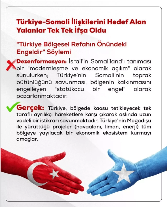 Dezenformasyon: İsrail’in Somaliland’ı tanıması bir "modernleşme ve ekonomik açılım" olarak sunulurken; Türkiye’nin Somali’nin toprak bütünlüğünü savunması, bölgenin kalkınmasını engelleyen "statükocu bir engel" olarak pazarlanmaktadır.