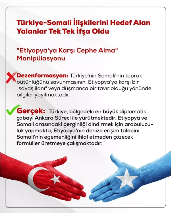 Dezenformasyon: Türkiye'nin Somali'nin toprak bütünlüğünü savunmasının, Etiyopya'ya karşı bir "savaş ilanı" veya düşmanca bir tavır olduğu yönünde bilgiler yayılmaktadır.