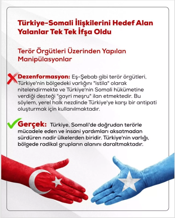 Dezenformasyon: Eş-Şebab gibi terör örgütleri, Türkiye'nin bölgedeki varlığını "istila" olarak nitelendirmekte ve Türkiye'nin Somali hükümetine verdiği desteği "gayri meşru" ilan etmektedir. Bu söylem, yerel halk nezdinde Türkiye'ye karşı bir antipati oluşturmak için kullanılmaktadır.