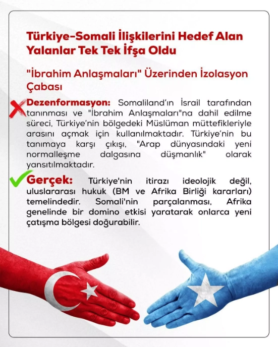 Dezenformasyon: Somaliland’ın İsrail tarafından tanınması ve "İbrahim Anlaşmaları"na dahil edilme süreci, Türkiye’nin bölgedeki Müslüman müttefikleriyle arasını açmak için kullanılmaktadır. Türkiye’nin bu tanımaya karşı çıkışı, "Arap dünyasındaki yeni normalleşme dalgasına düşmanlık" olarak yansıtılmaktadır.