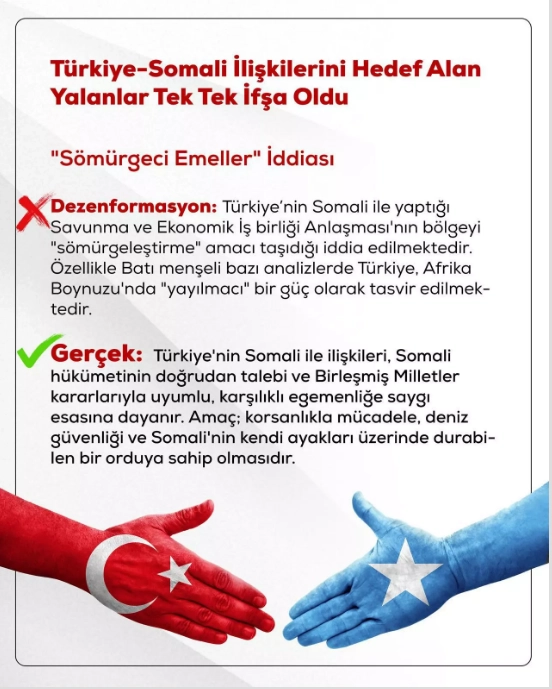 Dezenformasyon: Türkiye’nin Somali ile yaptığı Savunma ve Ekonomik İş birliği Anlaşması'nın bölgeyi "sömürgeleştirme" amacı taşıdığı iddia edilmektedir. Özellikle Batı menşeli bazı analizlerde Türkiye, Afrika Boynuzu'nda "yayılmacı" bir güç olarak tasvir edilmektedir.