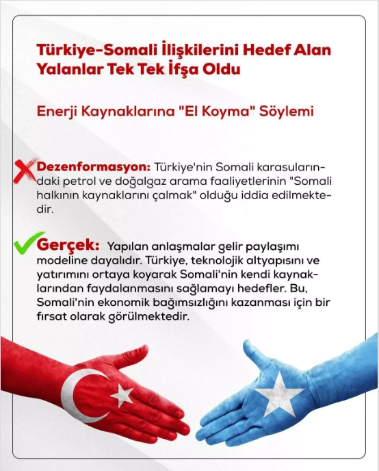 Dezenformasyon: Türkiye'nin Somali karasularındaki petrol ve doğalgaz arama faaliyetlerinin "Somali halkının kaynaklarını çalmak" olduğu iddia edilmektedir.