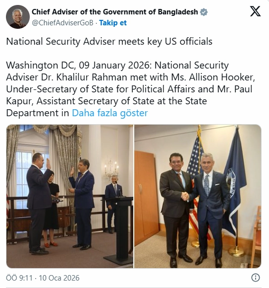Bangladeş Ulusal Güvenlik Danışmanı Khalilur Rahman, başkent Washington'da ABD'li diplomatlar Allison Hooker ve Paul Kapur ile görüştü.