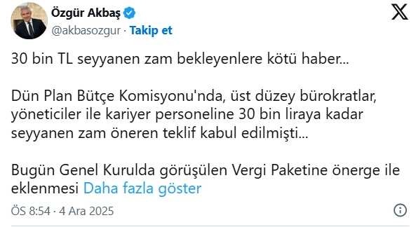 Dün Plan Bütçe Komisyonu'nda, üst düzey bürokratlar, yöneticiler ile kariyer personeline 30 bin liraya kadar seyyanen zam öneren teklif kabul edilmişti. Bugün Genel Kurul'da görüşülen Vergi Paketi'ne önerge ile eklenmesi planlanıyordu. Ancak, CHP "taşradakiler de yararlansın" dedi, uzlaşma çıkmadı. Ve Ak Parti, çalışma barışını da bozacağı eleştirileri nedeniyle düzenlemeyi genel kurula sunmaktan vazgeçti." dedi.