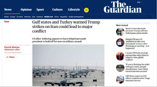 İngiliz The Guardian gazetesi; Türkiye, Suudi Arabistan, Katar ve Umman'ın yürüttüğü diplomatik temasların, ABD Başkanı Donald Trump'ı İran'a yönelik olası saldırıdan vazgeçirmede etkili olduğunu yazdı.