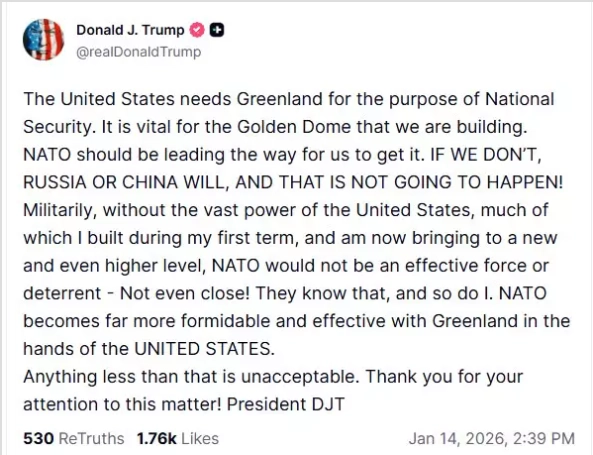 "Amerika Birleşik Devletleri, ulusal güvenlik amacıyla Grönland'a ihtiyaç duymaktadır. Bu, inşa ettiğimiz Altın Kubbe için hayati önem taşımaktadır. NATO, bunu elde etmemiz için öncülük etmelidir. BİZ YAPMAZSAK, RUSYA VEYA ÇİN YAPACAKTIR VE BU OLMAMALIDIR! Askeri açıdan, ilk dönemimde büyük ölçüde inşa ettiğim ve şimdi yeni ve daha da yüksek bir seviyeye taşıdığım Amerika Birleşik Devletleri'nin muazzam gücü olmadan NATO etkili bir güç veya caydırıcı olamaz - buna yaklaşamaz bile! Onlar da bunu biliyor, ben de biliyorum. Grönland ABD'nin elinde olduğunda NATO çok daha güçlü ve etkili hale gelir. Bundan daha azı kabul edilemez."