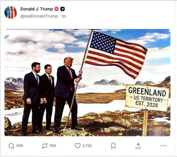 Ayrıca yayınlanan başka bir görselde Trump'ın kendisine yakın iki isimle birlikte "Grönland - ABD Toprağı - Kuruluş 2026" yazan bir tabelanın yanına ABD bayrağı dikerken resmedilmiş.
